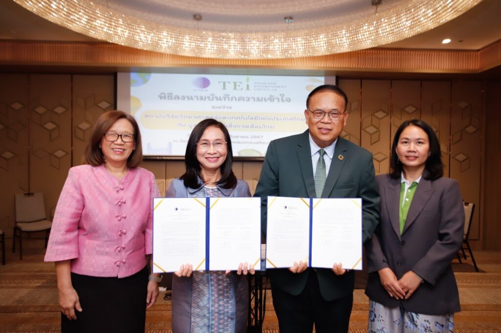 ดร.ชุติมา เอี่ยมโชติชวลิต ผู้ว่าการ สถาบันวิจัยวิทยาศาสตร์และเทคโนโลยีแห่งประเทศไทย (วว.) กระทรวงการอุดมศึกษา วิทยาศาสตร์ วิจัยและนวัตกรรม (อว.) และ ดร.วิจารย์ สิมาฉายา ผู้อำนวยการ สถาบันสิ่งแวดล้อมไทย ร่วมลงนามบันทึกความเข้าใจด้านการตรวจสอบวิเคราะห์และรับรองผลิตภัณฑ์ที่เป็นมิตรต่อสิ่งแวดล้อม รวมถึงการวิจัยและพัฒนาองค์ความรู้ทางด้านคุณภาพผลิตภัณฑ์และสิ่งแวดล้อม มีระยะเวลาดำเนินงาน 3 ปี โอกาสนี้ ดร.จิตรา ชัยวิมล รองผู้ว่าการบริการอุตสาหกรรม วว. นางสาวฉัตรตรี ภูรัต ผอ.ฝ่ายฉลากเขียวและฉลากสิ่งแวดล้อม มูลนิธิสถาบันสิ่งแวดล้อมไทย (ม.ส.ท.) ร่วมเป็นสักขีพยาน โดยมีคณะผู้บริหารและบุคลากรทั้งสองหน่วยงานร่วมเป็นเกียรติและแสดงความยินดีด้วย