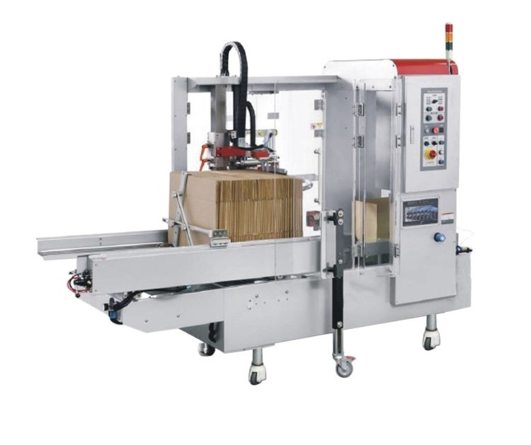 เครื่องขึ้นรูป และพับกล่องอัตโนมัติ สายพานหรือเทปกาวปรับความตึงได้เหมาะสำหรับลำเลียง และปิดผนึกกล่องที่ทำจากวัสดุที่ต่างกันได้ สามารถขึ้นรูปกล่องเป็นแนวตั้ง พับ และติดเทปกาวทั้งด้านล่าง และด้านบนของกล่องโดยอัตโนมัติ ความเร็วในการทำงานอยู่ที่ 18-26 กล่อง ต่อนาที มีระบบการแจ้งเตือนเมื่อไม่มีเทปกาว และกล่อง ...