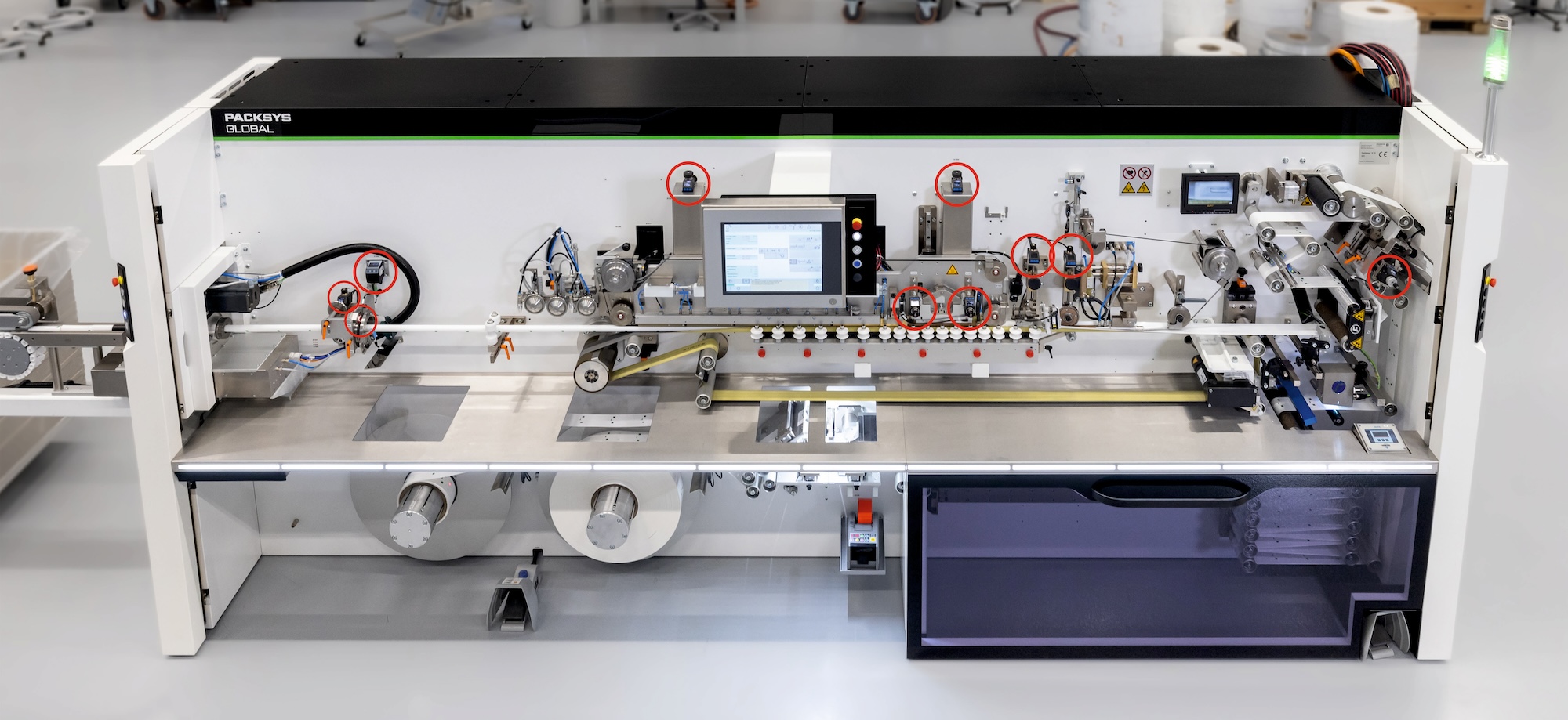 ค่าเพิ่มของการเปลี่ยนแปลงที่ตรวจสอบสามารถแสดงได้โดยใช้ตัวอย่างการตั้งค่า เซนเซอร์ Print Mark: ในการตัดส่วนท่อ จะต้องตัดในตำแหน่งที่ถูกต้องเมื่อเทียบกับภาพพิมพ์ ซึ่งทำได้โดยการใช้เครื่องหมายพิมพ์บนแผ่นลามิเนตที่เซนเซอร์ตรวจจับได้ เครื่องหมายจะอยู่ในตำแหน่งที่แตกต่างกันบนเส้นรอบวงของท่อขึ้นอยู่กับภาพพิมพ์ ดังนั้นตำแหน่งของเซนเซอร์บนเส้นรอบวงจะต้องแตกต่างกันเล็กน้อยเสมอเพื่อตรวจจับเครื่องหมายพิมพ์นี้ ตอนนี้สามารถบันทึกตำแหน่งของเซนเซอร์ Print Mark เป็นองศาและจัดเก็บในสูตรได้ด้วยตัวระบุตำแหน่ง AP10S ซึ่งหมายความว่าผู้ปฏิบัติงานไม่จำเป็นต้องเข้าไปในเครื่องเพื่อวางตำแหน่งเซนเซอร์เทียบกับเครื่องหมายพิมพ์ แต่ค่าตำแหน่งเป้าหมายจะถูกจัดเก็บไว้สำหรับภาพพิมพ์แต่ละภาพแทน